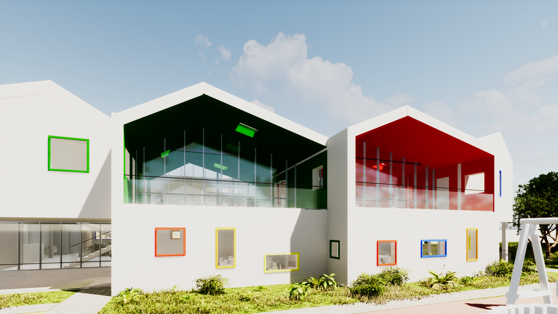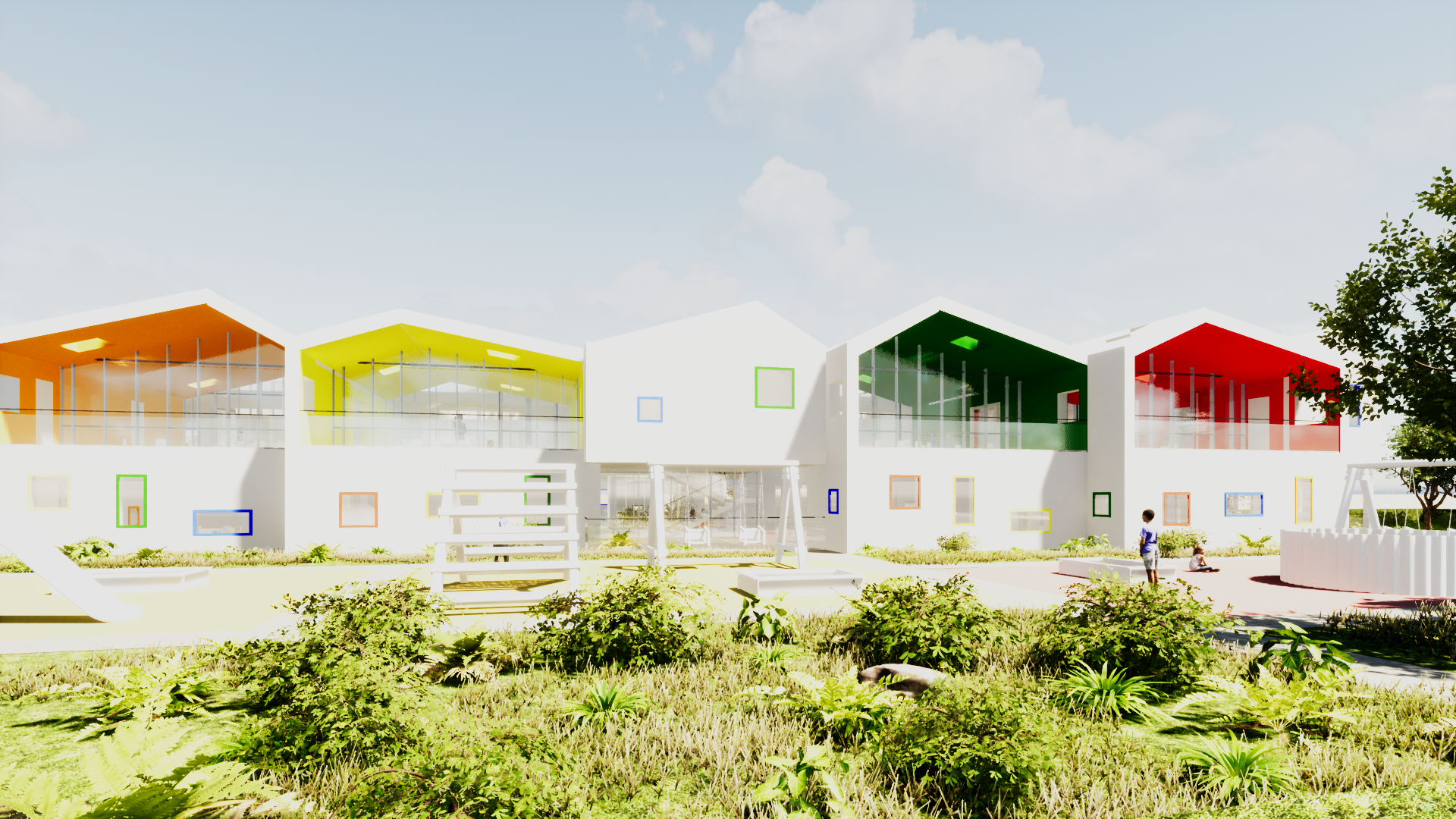 Vrtić je oblikovan izmicanjem i orijentacijom skupnih jedinica prema jugu, čime se optimizira osunčanje, higijenski uvjeti i prostorna dinamika građevine, a sama forma prilagođava neobičnoj parceli i ističe je u prostoru. U prizemlju su smještene vrtićke skupine povezane zajedničkim terasama koje potiču igru i socijalizaciju, dok se na katu nalaze jaslice s individualnim terasama koje stvaraju intimniji i zaštićeniji ambijent. Južna, razigrana i „dječja” strana vrtića otvara se prema igralištima i hortikulturi, dok sjeverna, racionalna i „odrasla” strana okuplja gospodarske, administrativne i servisne sadržaje. Između njih se razvija središnji prostor komunikacije i socijalizacije, oblikovan zimskim vrtovima, ateljeima i manjim „trgovima” koji razbijaju monotoniju hodnika, povezuju unutarnje i vanjske prostore te pridonose energetskoj učinkovitosti i edukaciji djece kroz hortikulturne aktivnosti. Skupne jedinice omogućuju različite scenarije korištenja – od svakodnevne igre i radionica do zajedničkih događanja kada se otvaraju u jedan kontinuirani prostor. Na sjeveru su smješteni PVN, blagovaonica i kuhinjski trakt, dok se na katu nalaze uredi, spremišta i garderobe osoblja, uz niše za razgovor i odmor. U podrumu je garaža koja istodobno može služiti kao sklonište, glavni ulazni trg oblikovan je s istočne strane, a servisni pristup osiguran je sa sjevera.